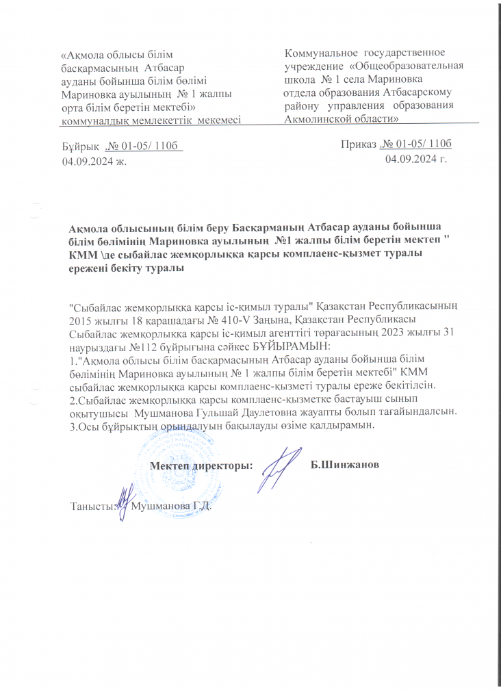 "Ақмола облысы білім басқармасының Атбасар ауданы бойынша білім бөлімі Мариновка ауылының № 1 жалпы орта білім беретін мектебі" коммуналдық мемлекеттік мекемесі