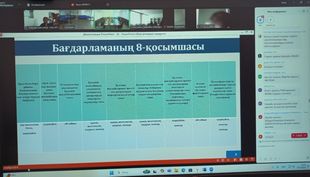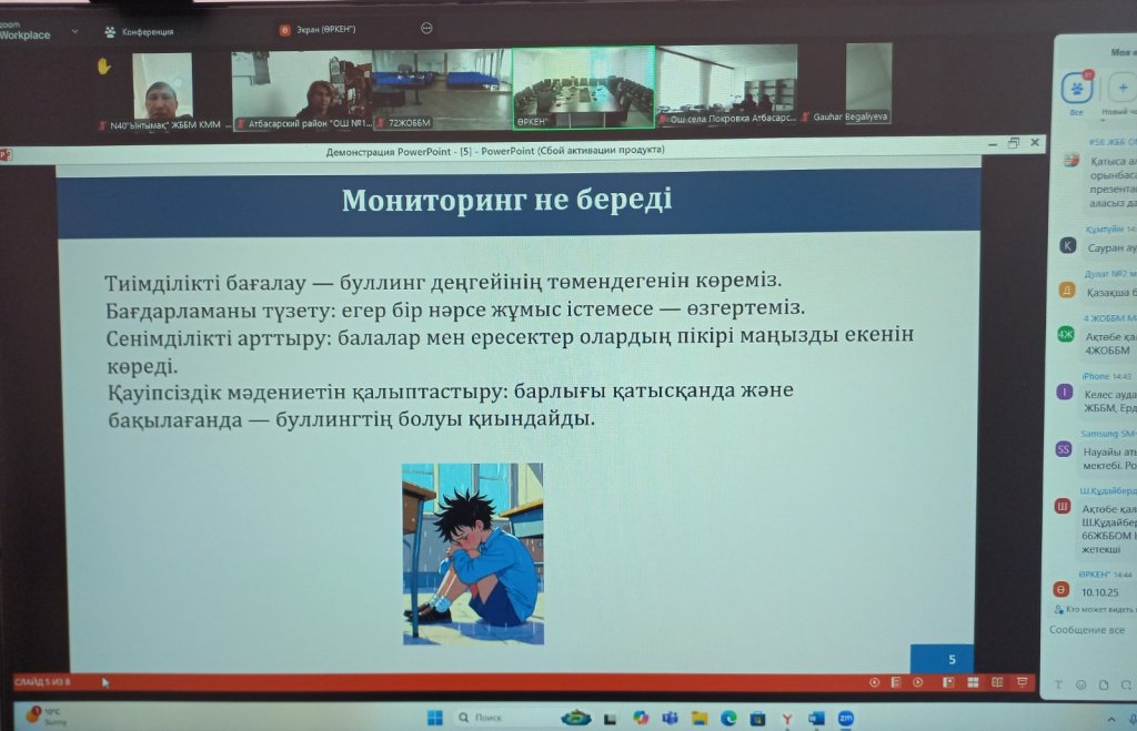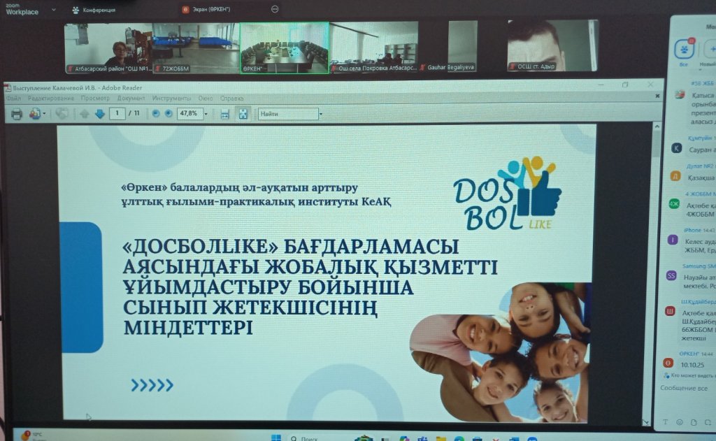 Балаларды қорқытудың (буллингтің) "ДосболLIKE" білім беру ұйымдарында алдын алу бағдарламасын енгізу сапасын қамтамасыз ету мақсатында 10 қазанда ZOOM платформасында "ӨРКЕН" балалардың әл-ауқатының Ұлттық ғылыми-практикалық институты "НАО ұйымдастырған директорлардың тәрбие жұмысы жөніндегі орынбасарларына арналған республикалық семинар өтті, оған Мариновка ауылының №1 ЖББМ" КММ директорының ТЖ орынбасары Холод И.П. қатысты.