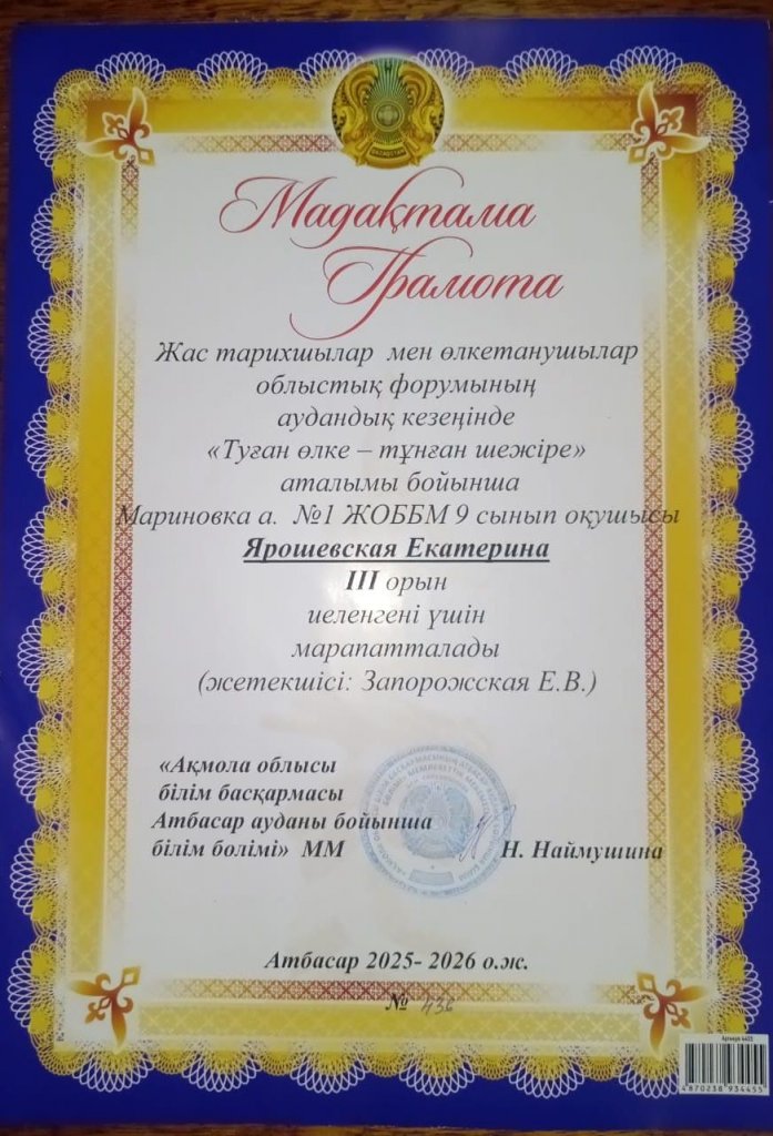 "Мариновка ауылының №1 жалпы білім беретін мектебі" КММ оқушысы Ярошевская Екатерина тарихқа жоғары қызығушылық танытып, III орынға ие болды.