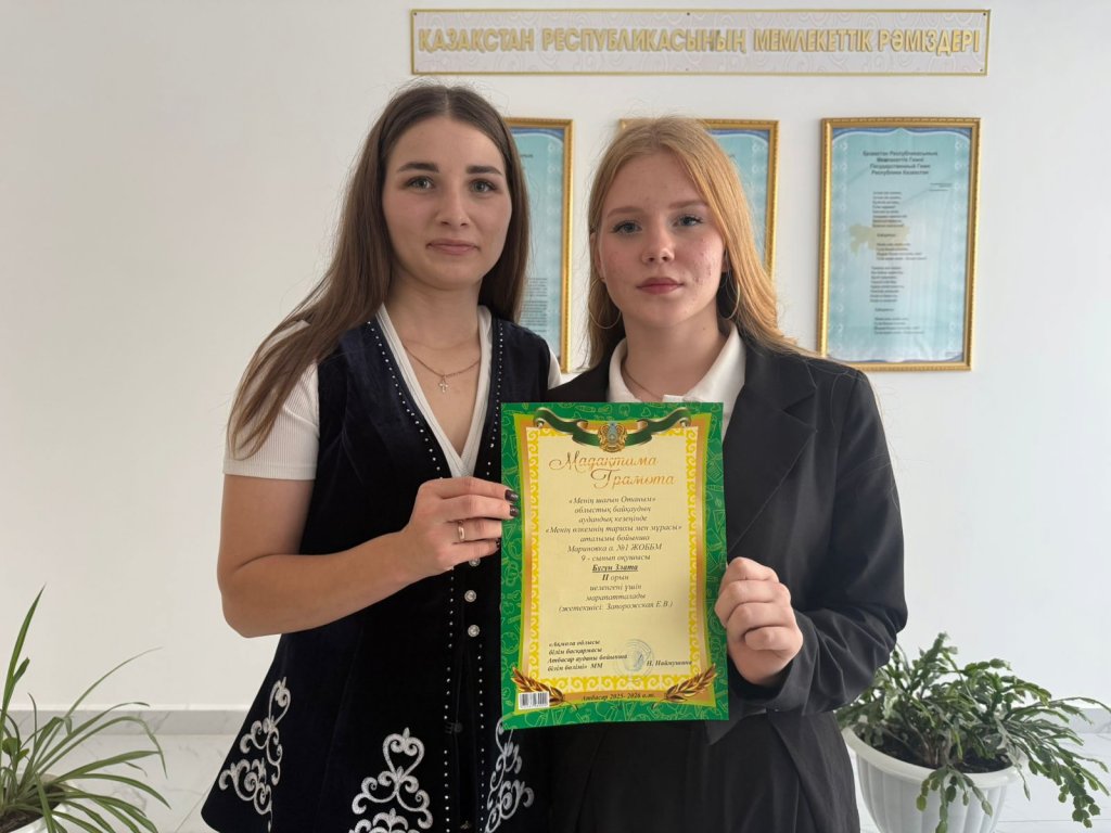 "Менің кіші Отаным" аудандық байқауында "Менің өлкемнің тарихы" номинациясы бойынша "Мариновка ауылының №1 жалпы білім беретін мектеп" КММ оқушысы Бугун Злата, 9 "Б" сынып оқушысы өз мектебін және туған ауылын лайықты түрде таныстырып, II орын алды.