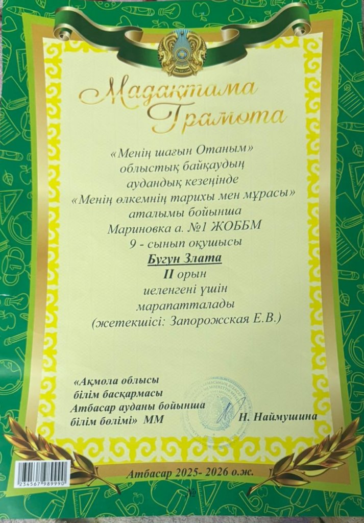 2025 жылғы 22 қазанда Атбасар қ. N2 ЖББМ базасында ауыл мектептерінің 9-11 сынып оқушылары арасында жалпы білім беретін пәндер бойынша республикалық олимпиаданың екінші турының жеңімпаздарын марапаттау рәсімі өтті. Олимпиаданың облыстық кезеңіне Мариновка ауылындағы N 1 ЖББМ, КММ-нің бес оқушысы қатысады.