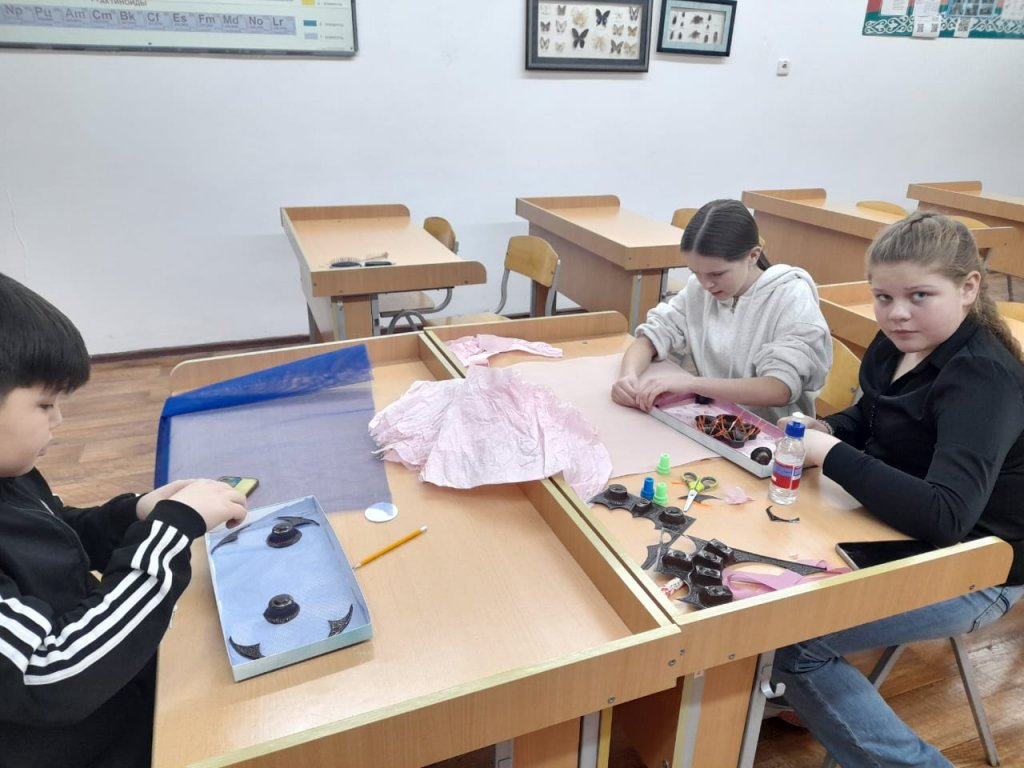 "Эколуч" экологиялық үйірмесінің аясында 6 сынып оқушылары үйірме жетекшісі И. Я. Штольмен бірлесіп қалдық материалдан қолөнер жасады.